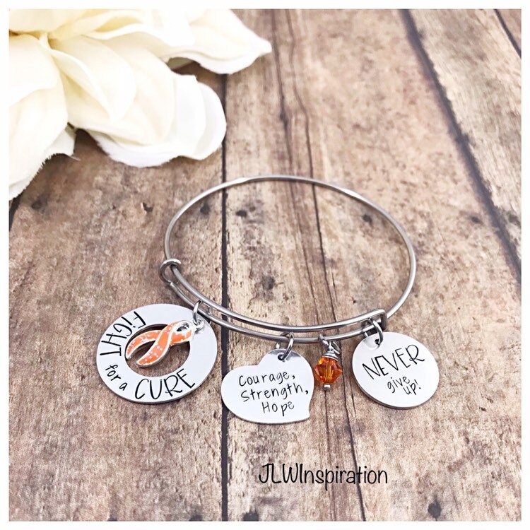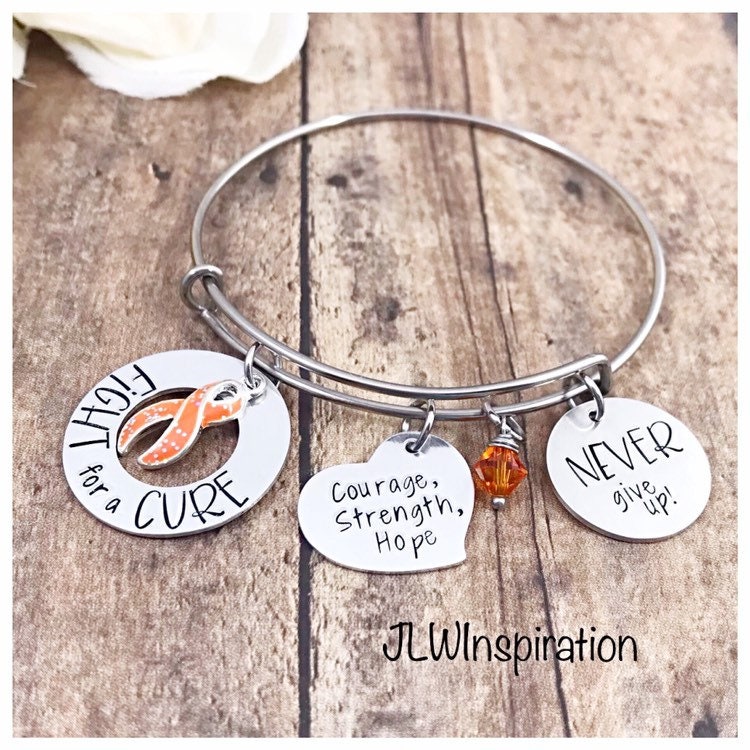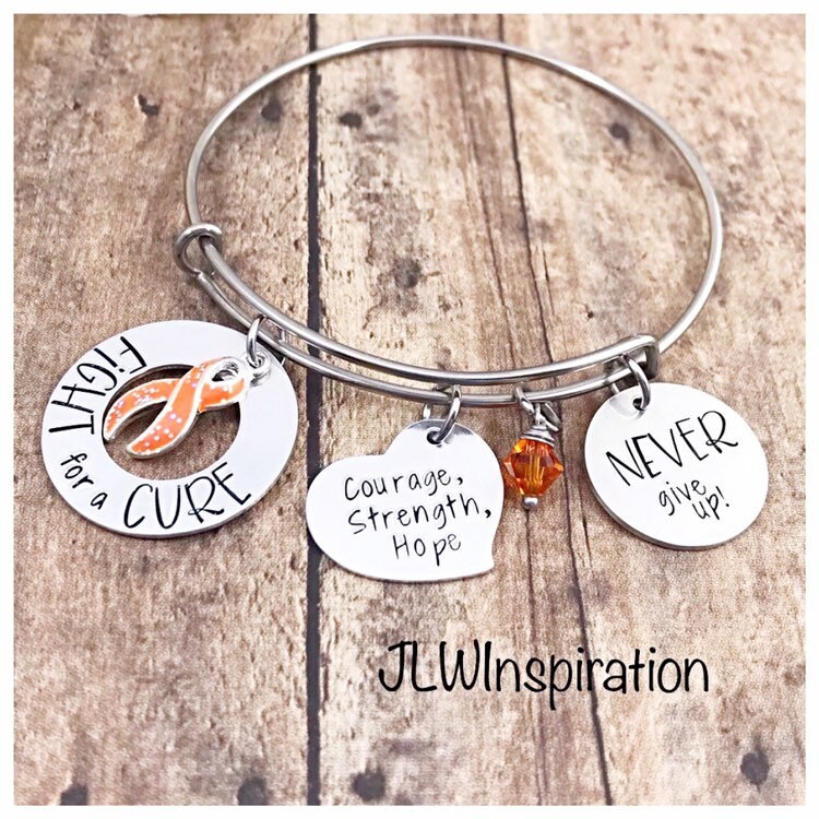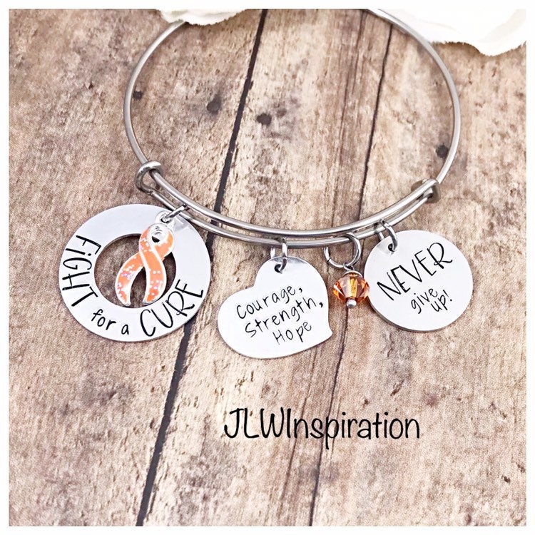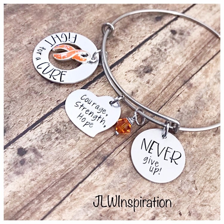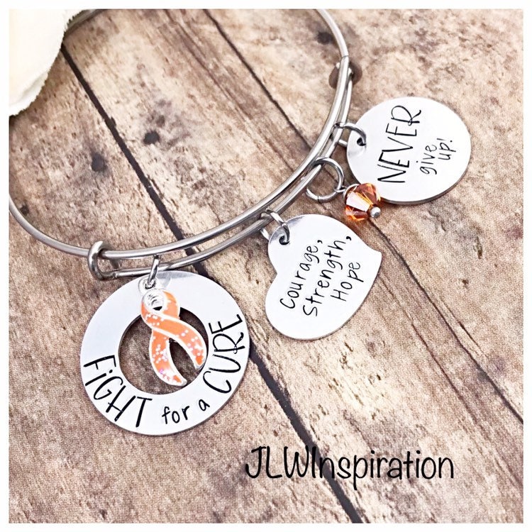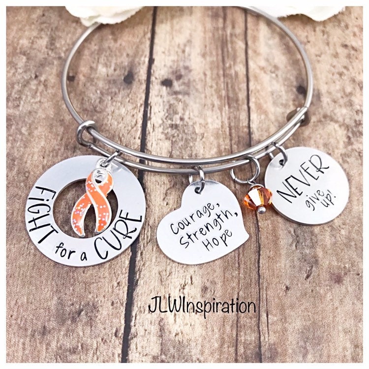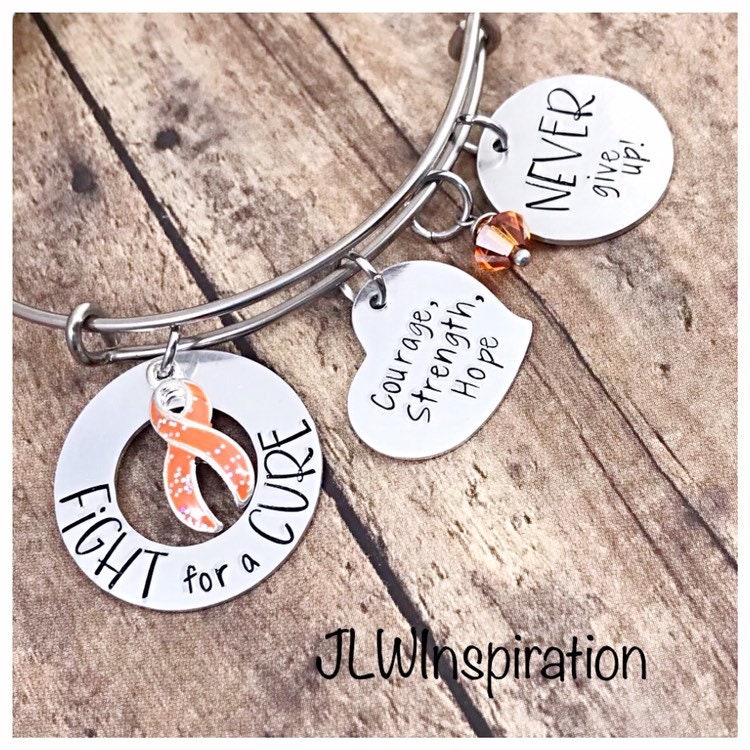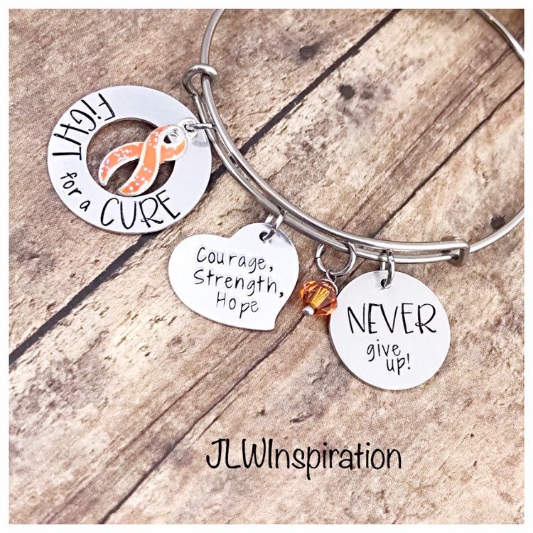 -Orange glitter awareness ribbon over a 1" aluminum washer hand stamped with "FIGHT for a CURE"
