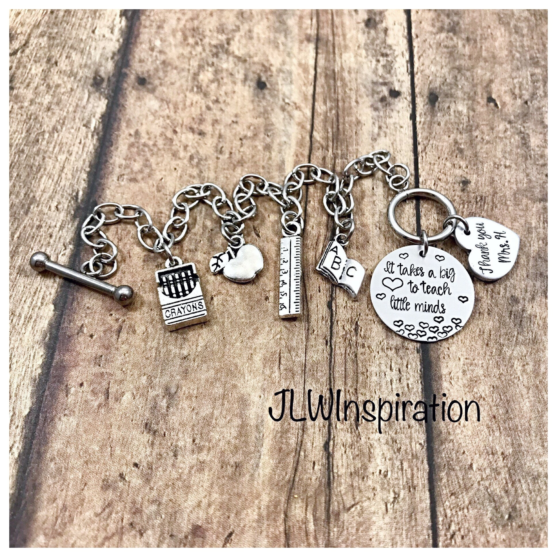 This is a stainless steel chain, toggle clasp charm bracelet. Stamped on the 7/8" aluminum circle is "It takes a big heart to teach little minds" with custom teacher's initial on the 5/8" aluminum heart and crayons, ruler, apple and book charms. Just choose from the drop down menu which length you would like.