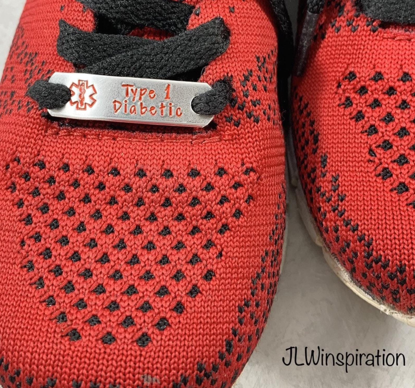 This is a medical alert shoe tag in aluminum. This is stamped with a medical symbol and "Type 1 Diabetic" in red ink (if you would like a different saying or color just send me a message). You have your choice of the rectangle or teardrop shape, and single (one shoe) or double (both shoes) tags, just select from the drop down menu.