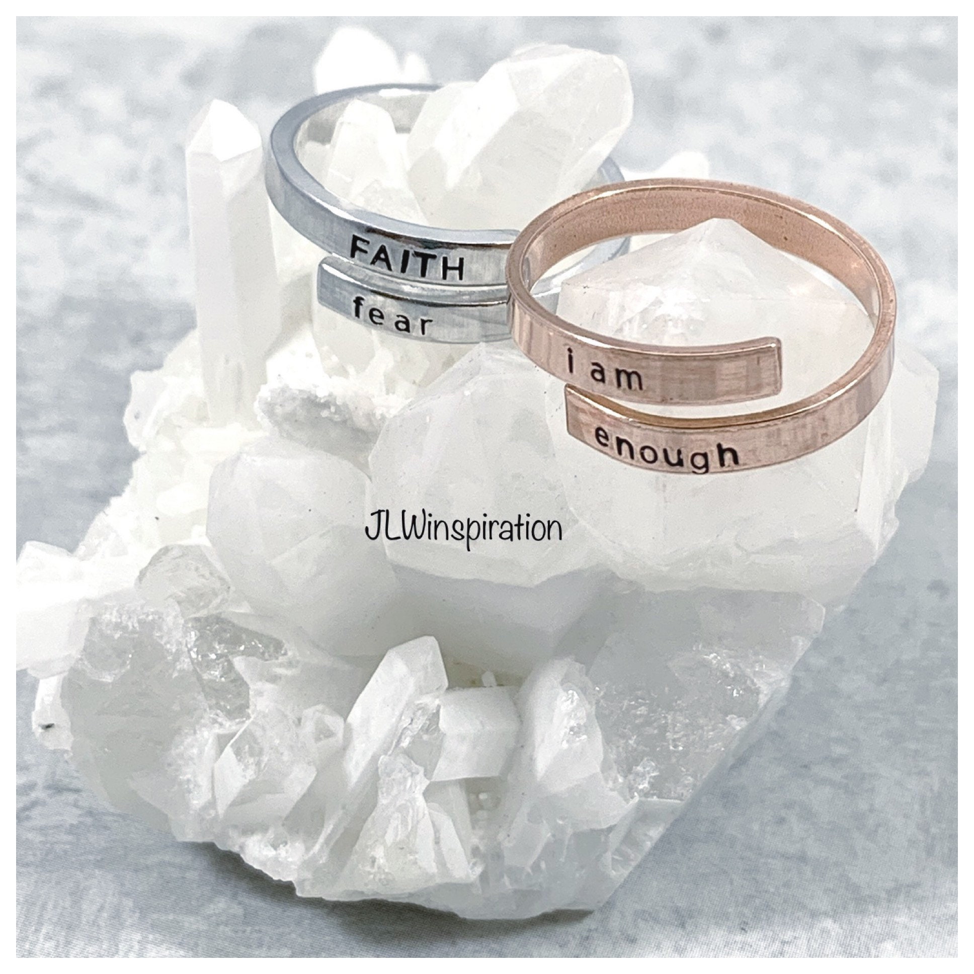This is a 1/8" aluminum or copper wrap ring stamped with phrase of your choice. Just choose your size and which metal you would like from the drop down menu. Put phrase/words to stamp in the personalization box (if not entered I will make ring as pictured).
